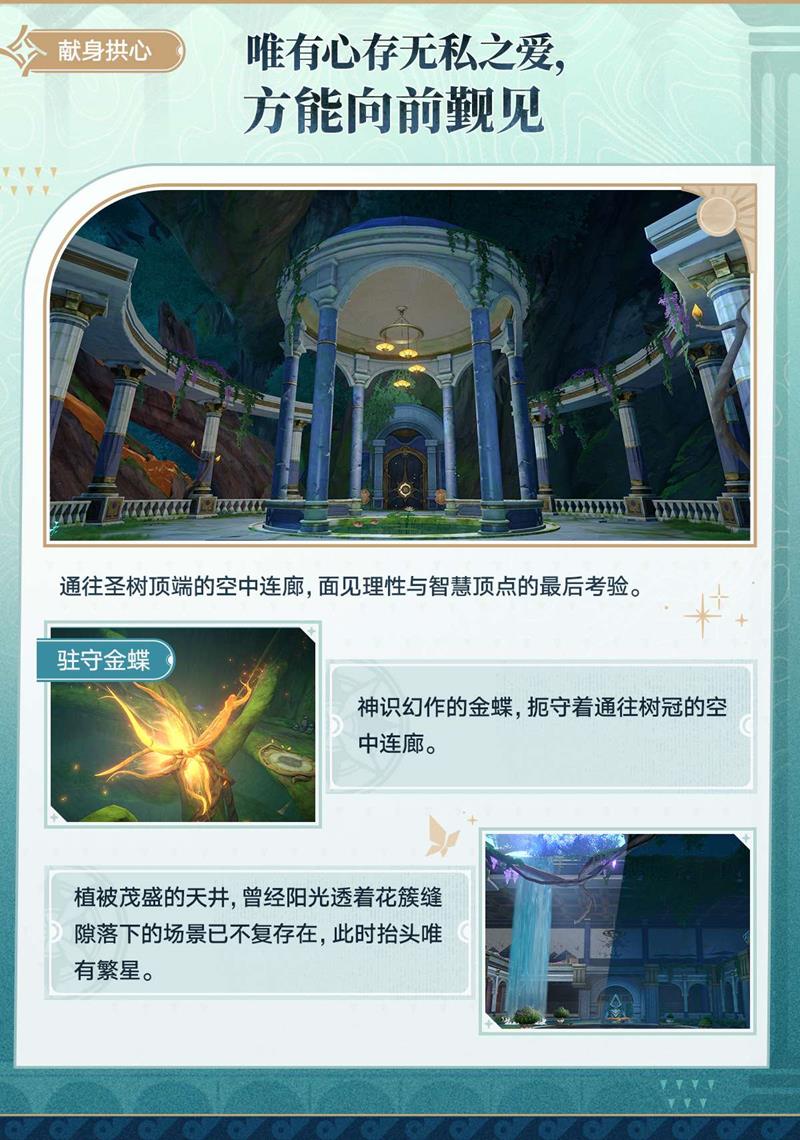 献身拱心,唯有心存无私之爱,方能向前觐见。通往圣树顶端的空中连廊,面见理性与智慧顶点的最后考验。驻守金蝶,神识幻作的金蝶扼守着通往树冠的空中连廊。
