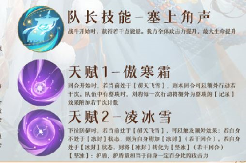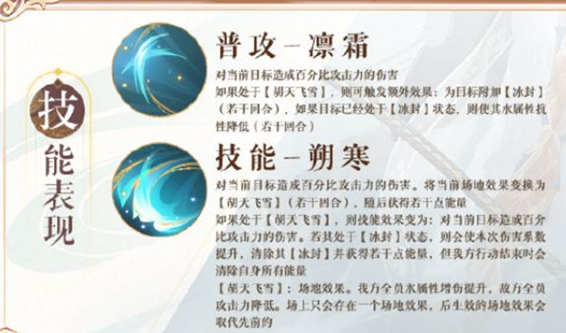 【胡天飞雪】:场地效果。我方全员水属性增伤提升,敌方全员攻击力降低。场上只会存在一个场地效果,后生效的场地果会取代先前的。