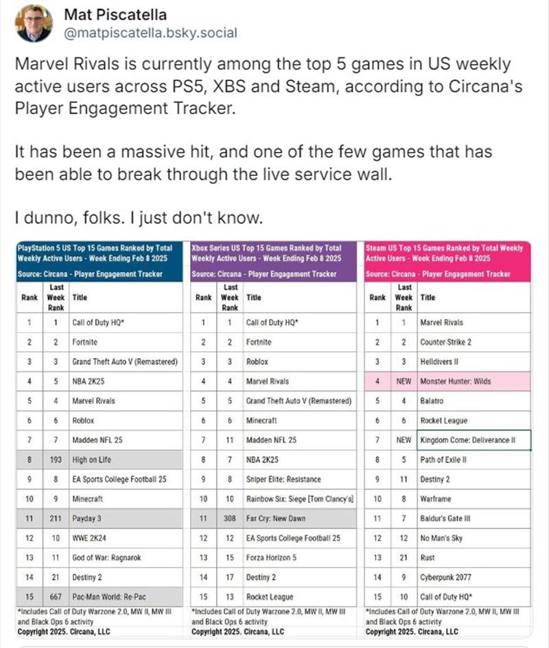 尽管如此,裁员消息还是令人意外,因为《漫威争锋》自 12 月发布以来,在 Steam 上一直保持着高玩家数量。Circana 分析师 Mat Piscatella 周二表示,《漫威争锋》目前在美国 PS5、Xbox 和 Steam 平台的周活跃用户中排名前五。“这款游戏取得了巨大成功,是少数能够突破在线服务壁垒的游戏之一,”他写道,“我不知道,伙计们,我真的不知道。”