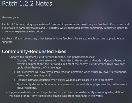 《宣誓》首个重大更新补丁1.2.2已于2025年2月21日正式上线,更新内容包括对游戏进度系统、装备等级系统、同伴与NPC表现、游戏稳定性等多方面的优化和改进。共计60余项修复与调整。我们来看看吧。