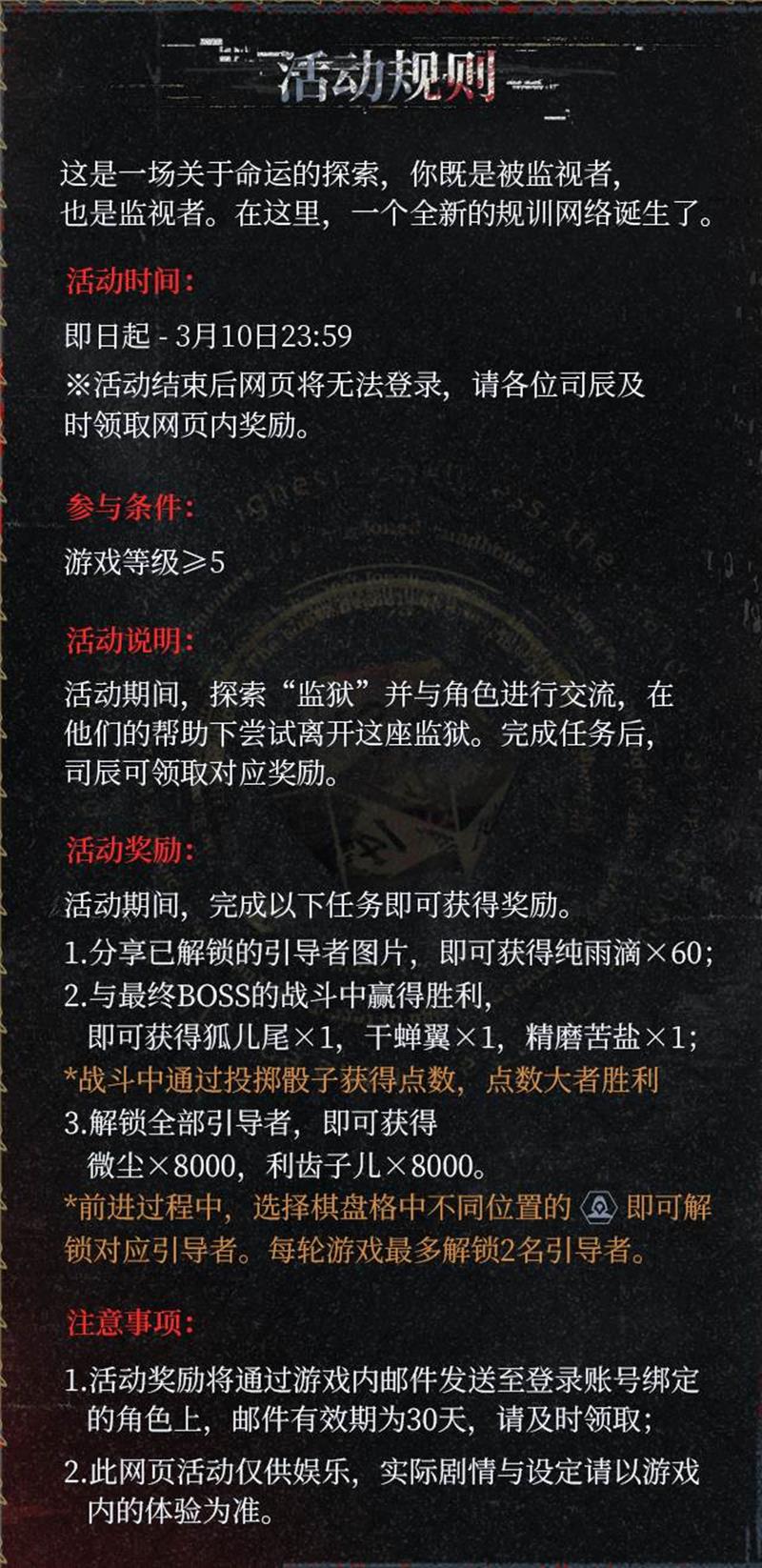 活动期间,探索“监狱”并与角色进行交流,在他们的帮助下尝试离开这座监狱。完成任务后即可领取对应奖励,详情请前往活动页内查看。此网页活动仅供娱乐,实际剧情与设定请以游戏内的体验为准。