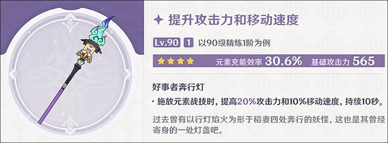 90级时:基础攻击力: 565、元素充能效率: 30.6%,属于中等能力的加充能武器。