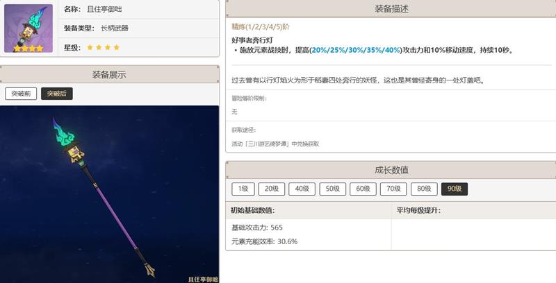 以上就是对原神中且住亭御咄的简要分析了,总体而言还是很适合作为过渡装备来使用,在活动奖励武器中算是好用的那一批,可以养成。如果这篇攻略对你有帮助,还请点个收藏关注一下切游网,各位读者的支持就是我们持续更新的最大动力。