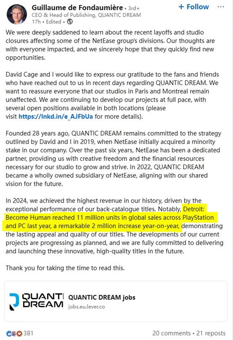 据Quantic Dream最新发布的领英招聘信息显示,截至2024年底,其代表作《底特律:变人》(也称《底特律:化身为人》)全球销量已经突破1100万套,仅2024年一年便增长了200万套。这一惊人数据不仅展现了这款以叙事为核心的互动剧情游戏在全球市场的强劲吸引力,也为开发商Quantic Dream的未来发展奠定了坚实基础。