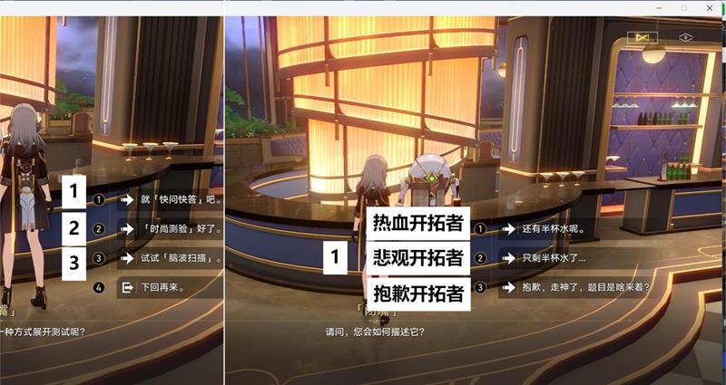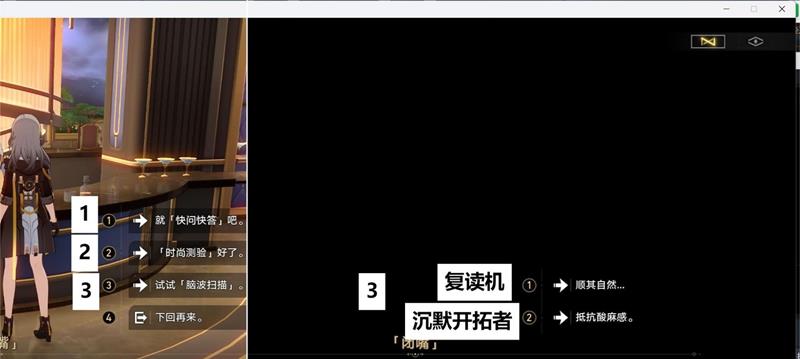 例如:在过剧情时,丹恒说【666】,那么如果后面的对话选项中有【666】,那么我们就选择【666】就可以了,也就是复读一遍角色说过的话就可以了。