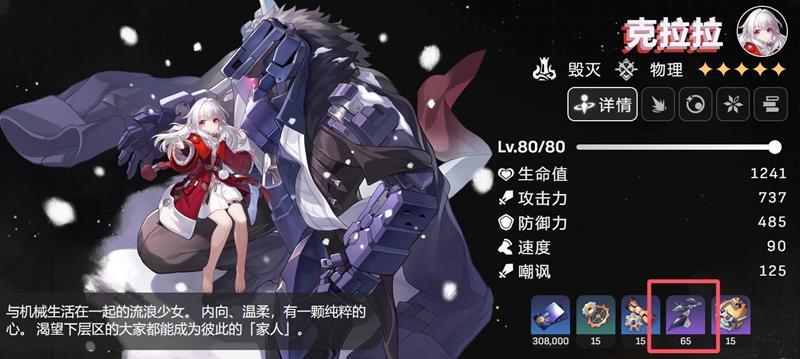 克拉拉的角色升阶(突破)累计需要消耗65个铁狼碎齿;