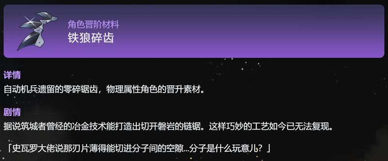 崩坏星穹铁道的铁狼碎齿是一种角色晋阶材料,很多小伙伴想要知道崩坏星穹铁道的铁狼碎齿有哪些用途,我们一起来看看吧。