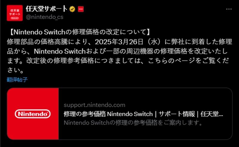 此外,Nintendo Switch Pro控制器的维修费用保持不变,仍为4290日元(约210元人民币)。