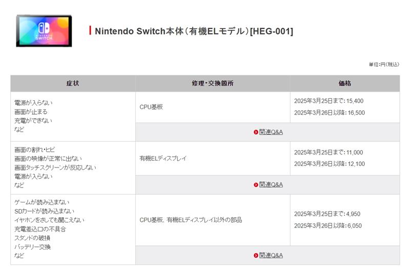 而OLED版本的Switch,其CPU主板维修费用从15400日元(约755元人民币)提升至16500日元(约808元人民币),OLED显示屏的维修费用也从11000日元(约539元人民币)增加到12100日元(约593元人民币)。