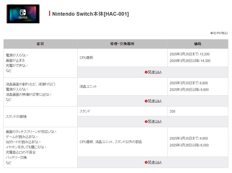 具体来看,Nintendo Switch各型号主机的修理费用普遍上涨了1100日元,折合人民币约54元。其中,普通版Switch的CPU主板维修费用从13200日元(约646元人民币)调整至14300日元(约701元人民币);液晶单元的维修费用从8800日元(约431元人民币)上涨至9900日元(约485元人民币)。