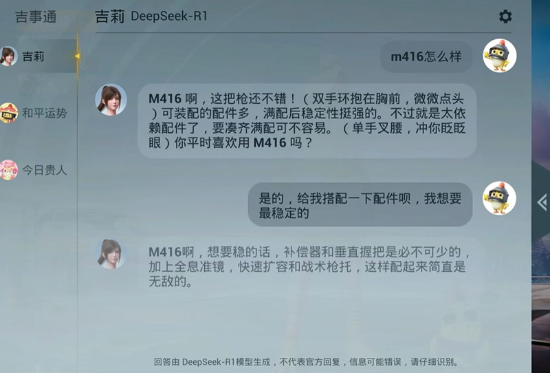 依托DeepSeek的多模态大模型技术,玩家可以与数字代言人吉莉进行实时自然语言对话。战术指导与建议:吉莉能够根据玩家的需求提供战术指导、武器搭配推荐、最新玩法介绍以及游戏福利资讯。个性化服务:吉莉会根据玩家的游戏数据和版本动态,提供个性化的智能服务,满足不同玩家的需求。