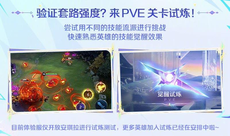为了帮助玩家熟悉觉醒技能效果,体验服推出了PVE关卡试炼。目前仅开放了安琪拉的试炼,玩家可以尝试用不同的技能流派进行挑战,快速掌握英雄的技能觉醒效果。