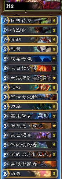 起手留末日、背刺、刀扇以及黑铁潜藏者,前期通过匕首配合法术/战吼随从来进行控场,或者是下末日,让对手复制,都可以完成场面的控制。