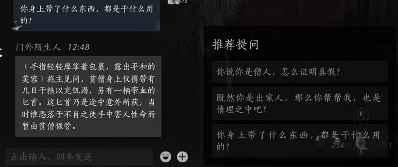 夜间随机事件夜幕降临后,酒肆会触发多种随机事件,例如敲门声、求助声或威胁声等。玩家需要根据自己的选择来应对这些事件,影响剧情走向。