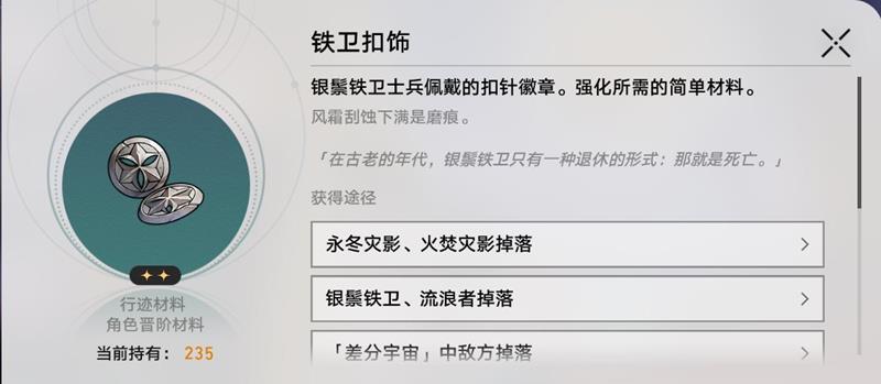 铁卫扣饰可以用于角色晋阶和行迹升级