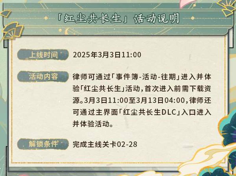 活动内容 律师可通过「事件簿-活动-往期」进入并体验「红尘共长生」活动,首次进入前需下载资源。3月3日11:00至3月13日04:00,律师还可通过主界面「红尘共长生DLC」入口进入并体验活动。