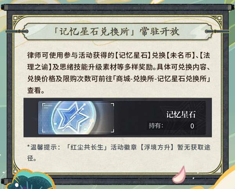 律师可使用参与活动获得的【记忆星石】兑换【未名币】、【法理之谕】及思绪技能升级素材等多样奖励。具体可兑换内容、兑换价格及限购次数可前往「商城-兑换所-记忆星石兑换所」查看。