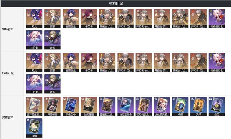希儿、彦卿、真理医生、卡芙卡、开拓者、仙舟三月七、三月七、青雀的角色升阶(突破)和技能行迹升级都需要消耗掠夺的本能。