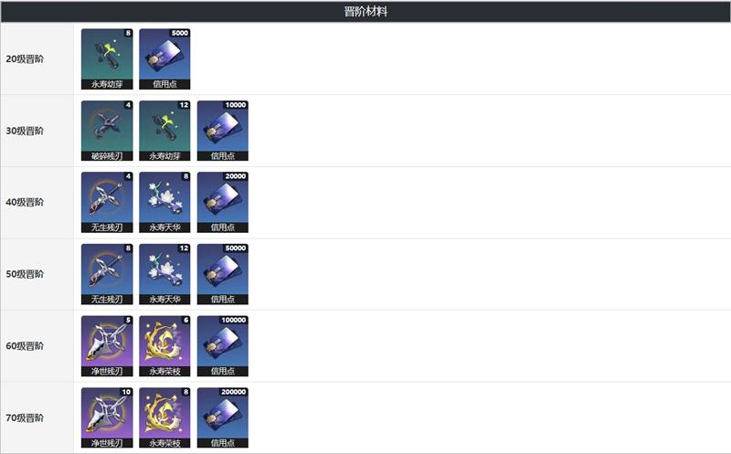 70级晋阶:净世残刃10、永寿荣枝8、信用点200000