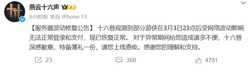 3月3日22点开始,因中国移动出现严重网络故障,导致使用该运营商服务的用户无法登录网易游戏产品。经技术部门与中国移动紧急沟通处理,受影响的网易游戏产品服务均已恢复。给您带来不便,深感抱歉。