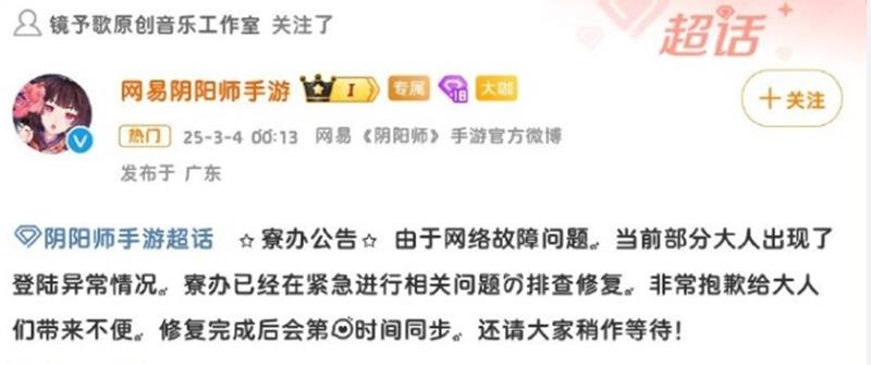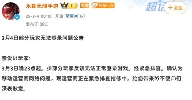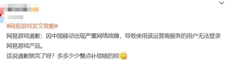 在公告中,官方表示,自3月3日22点开始,因中国移动出现严重网络故障,导致使用该运营商服务的用户无法登录网易游戏产品。经技术部门与中国移动紧急沟通处理,受影响的网易游戏产品服务均已恢复。给您带来不便,深感抱歉。