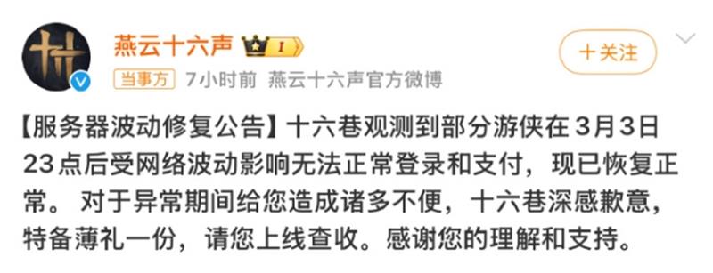 十六巷观测到部分游侠在3月3日23点后受网络波动影响无法正常登录和支付,现已恢复正常。 对于异常期间给您造成诸多不便,十六巷深感歉意,特备薄礼一份,请您上线查收。感谢您的理解和支持。