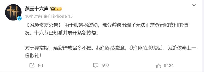 官方表示由于服务器波动,部分游侠出现了无法正常登录和支付的情况,十六巷已知悉并展开紧急修复。
