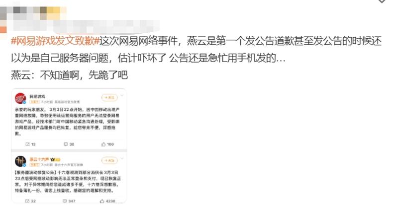 在这有玩家调侃,第一条惊慌失措以为是自己出了问题,第二条才知道是网易网络崩了。