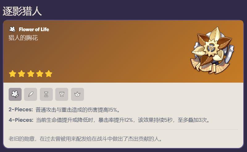 逐影猎人套装能够显著增强普通攻击和重击的伤害,同时提供较高的暴击率加成,非常适合莱欧斯利的输出模式。