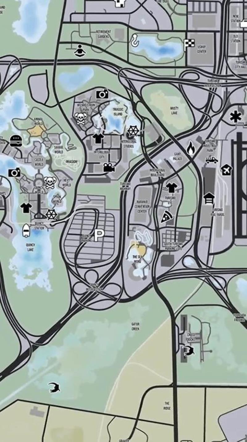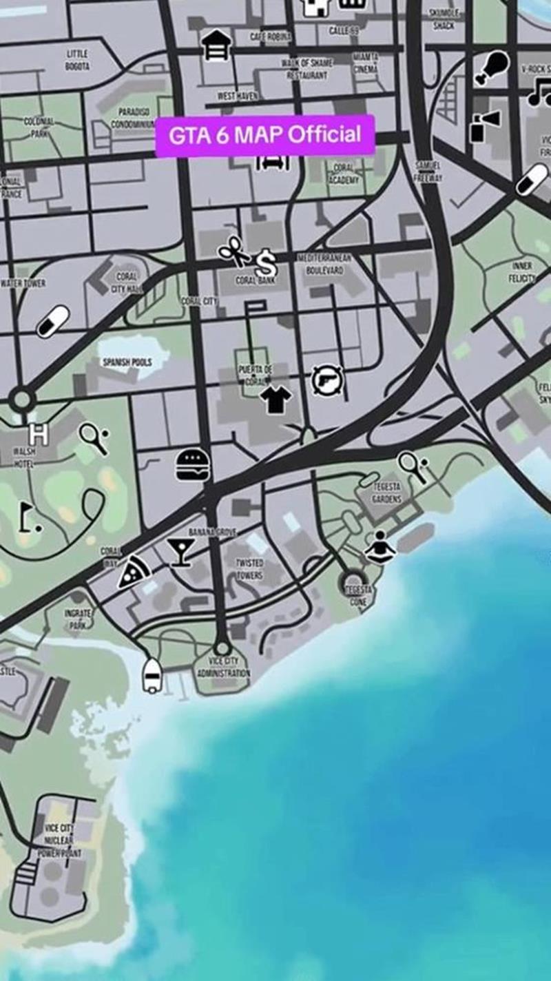 据外媒报道,网络上日前流传着一张疑似《GTA6》的世界地图,其中标注了各种兴趣点,包括药店、商店、船只停靠点以及其他重要地点。