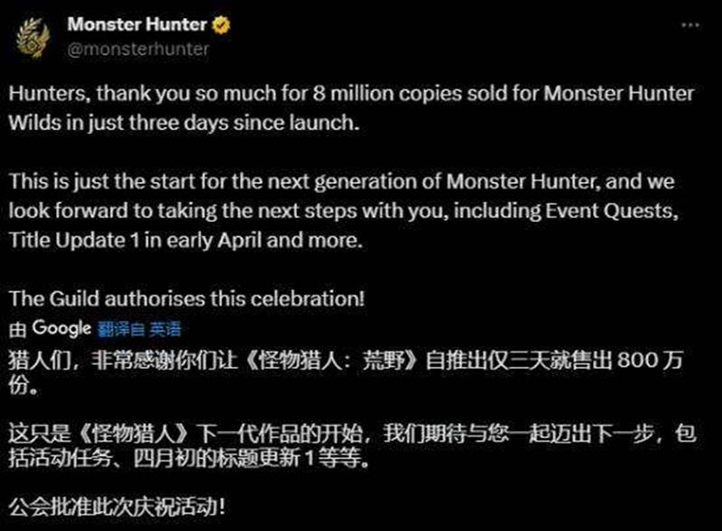 官方表示:“猎人们,非常感谢你们让《怪物猎人:荒野》在推出仅三天就售出800万份。这只是《怪物猎人》下一代作品的开始,我们期待与您一起迈出下一步,包括活动任务、四月初的更新1等等。公会批准此次庆祝活动!”