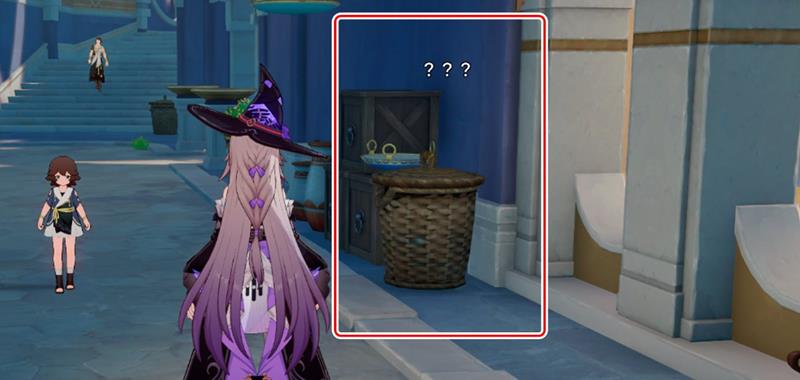 我们来到下图所示的位置,调查上面标有三个问号的竹篓子,会冒出一个叫做第欧根娜的NPC和开拓者进行对话。