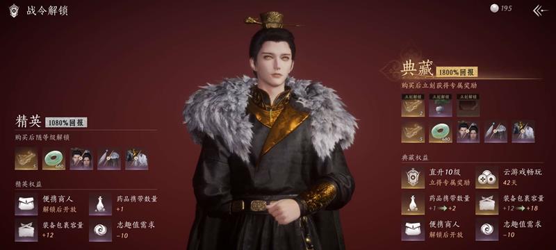 典藏战令(售价128元):除了包含精英战令的所有奖励外,还能立即提升10级,获得更多稀有装扮和更高的经验加成。