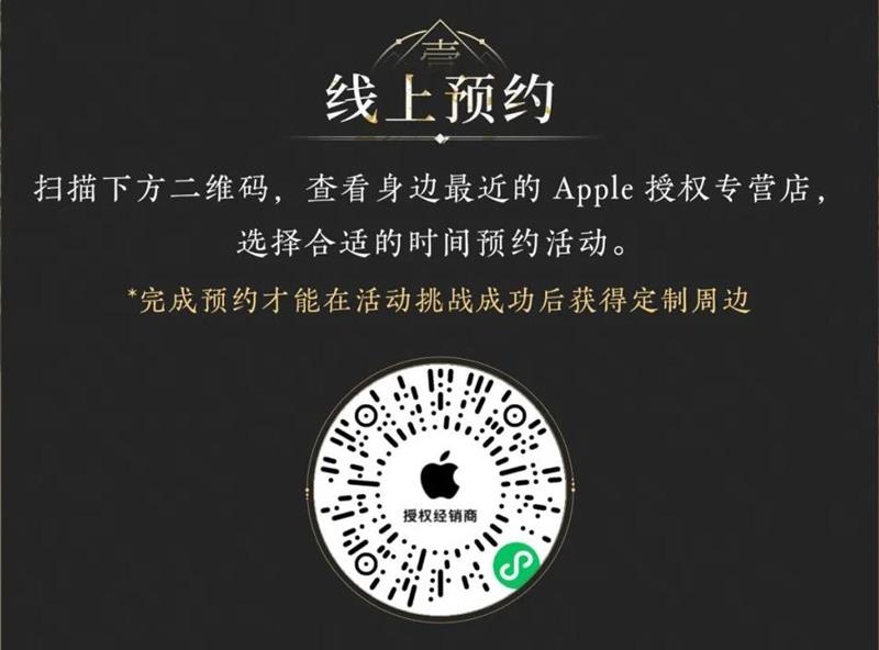 线上预约 扫描下方二维码,查看身边最近的 Apple 授权专营店,选择合适的时间预约活动。 完成预约才能在活动挑战成功后获得定制周边。