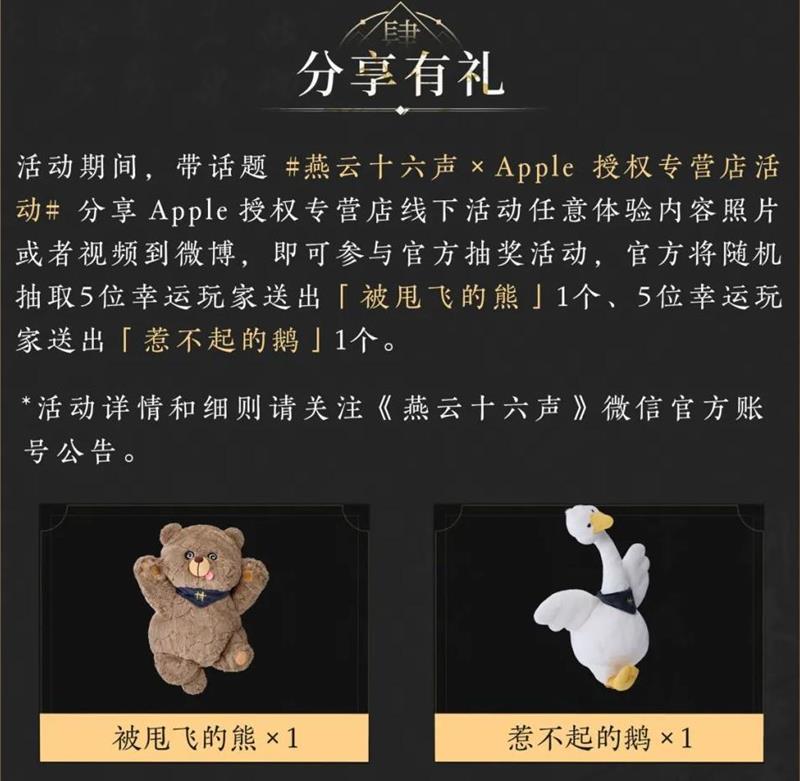 分享有礼 活动期间,带话题#燕云十六声×Apple 授权专营店活动#分享Apple 授权专营店线下活动任意体验内容照片或者视频到微博,即可参与官方抽奖活动,官方将随机抽取5位幸运玩家送出「被甩飞的熊」1个、5位幸运玩家送出「惹不起的鹅」1个。 *活动详情和细则请关注《燕云十六声》微信官方账号公告。