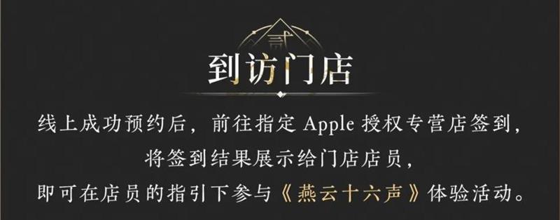 到访门店 线上成功预约后,前往指定 Apple 授权专营店签到,将签到结果展示给门店店员,即可在店员的指引下参与《燕云十六声》体验活动。