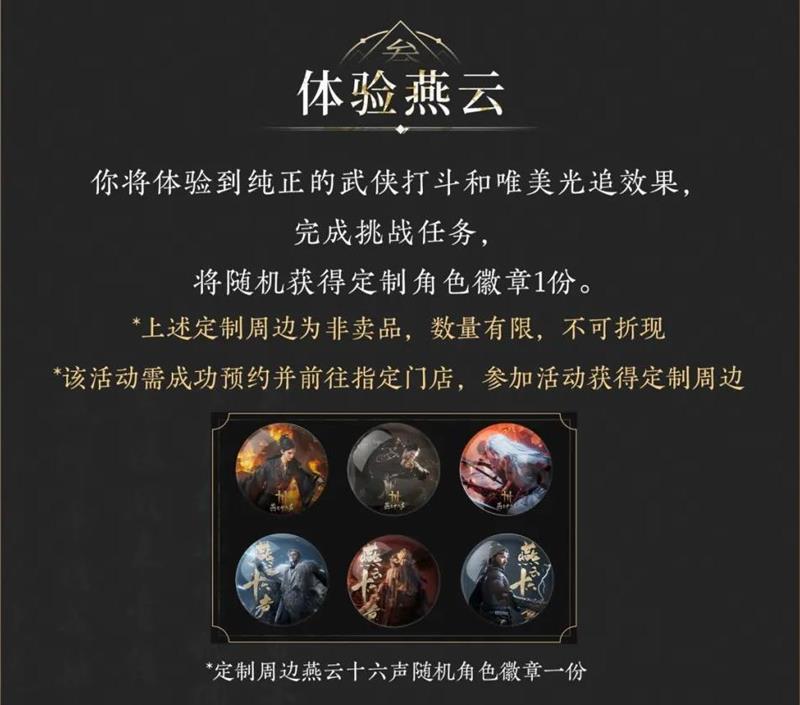 体验燕云 你将体验到纯正的武侠打斗和唯美光追效果,完成挑战任务,将随机获得定制角色徽章1份。 *上述定制周边为非卖品,数量有限,不可折现 *该活动需成功预约并前往指定门店,参加活动获得定制周边。