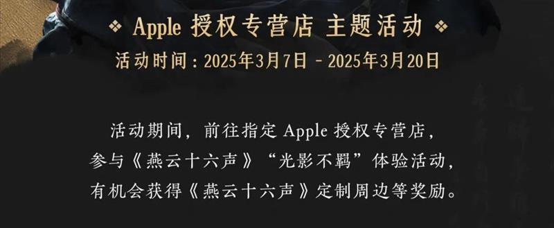燕云十六声宣布与苹果授权专营店的线下活动即将开启。活动期间,前往指定 Apple 授权专营店,参与《燕云十六声》“光影不羁”体验活动,有机会获得《燕云十六声》定制周边等奖励。下面是详细的活动内容一览,我们一起来看一看。
