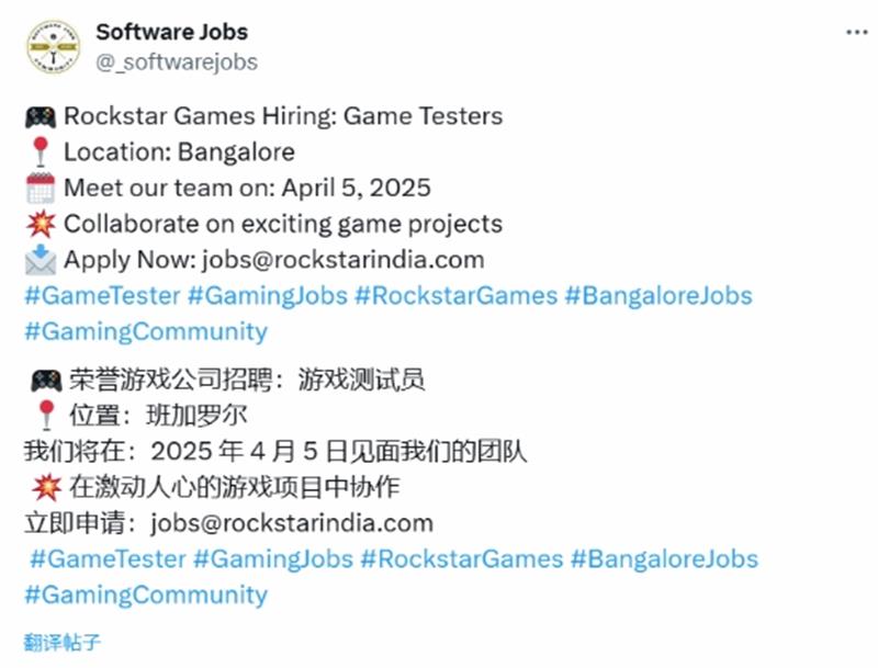 据国外一推主曝光的招聘信息显示,R星印度正在班加罗尔办公室招聘游戏测试员,要求应聘者“参与令人兴奋的游戏项目”,并明确标注录用者将于2025年4月5日正式入职。