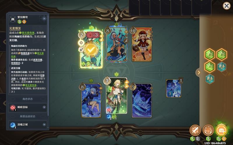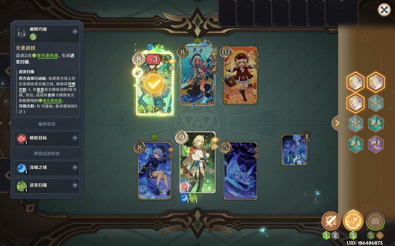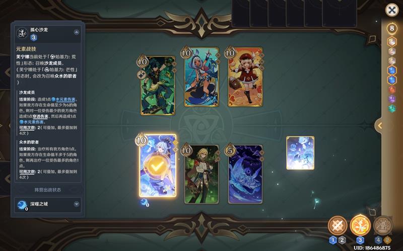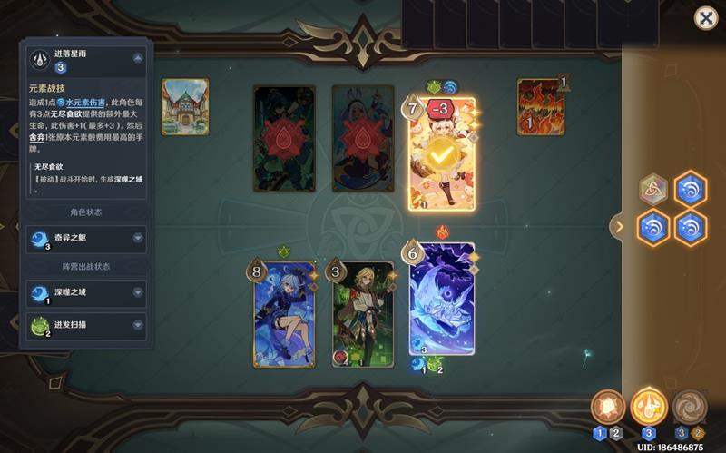 推荐选择芙宁娜、卡维和吞星之鲸这三张角色牌,并且手牌中全部编入3费卡。虽然无手牌通关对手牌的要求较低,但为了降低对元素骰子的需求,建议旅行者们带上一掷乾坤、最好的伙伴等卡牌来增加骰子的容错率。