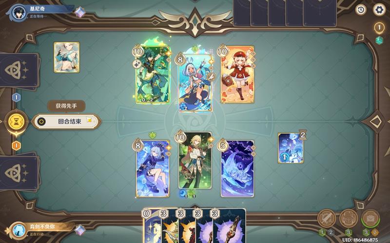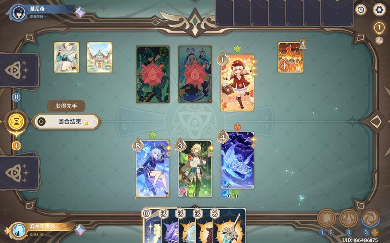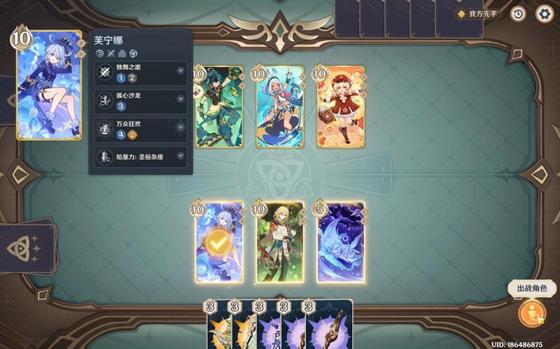 具体流程如下:在准备及投掷阶段,选择芙宁娜作为初始出战角色,第一回合需要水骰和草骰各三个,投掷阶段尽量寻找水、草骰子。