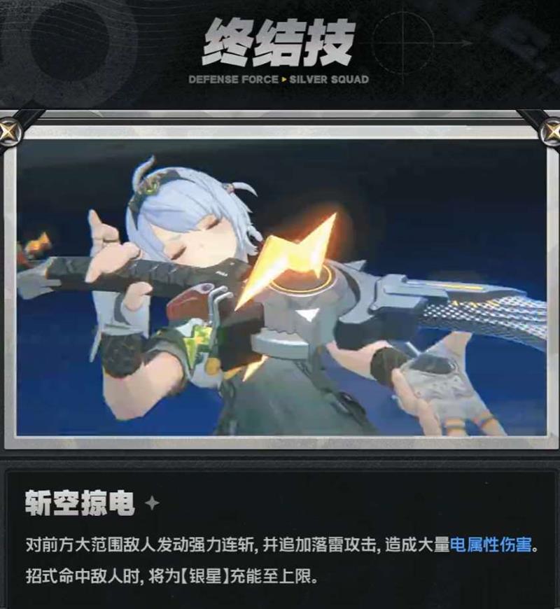 强化特殊技与终结技强化特殊技:长按发动,可快速将银星标记充能至上限,并发动高速斩击,造成大量电属性伤害。终结技:对前方造成大范围强力斩击,命中后将银星标记充能至上限,适合在失衡期内快速输出。