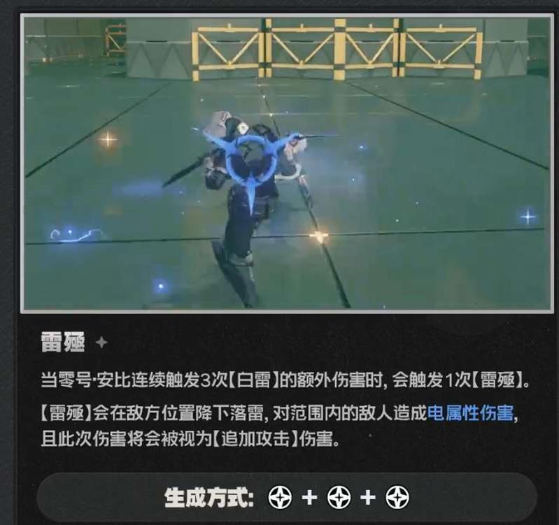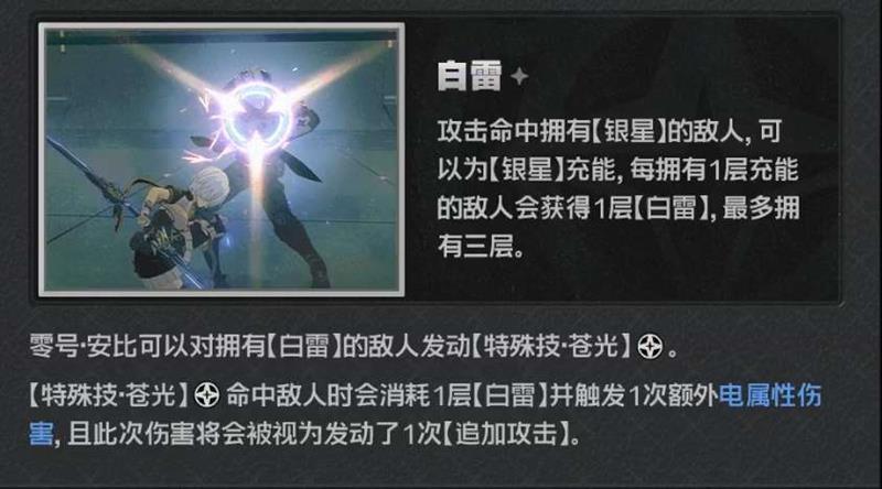 追加攻击零号·安比的追加攻击是其主要伤害来源之一。当敌人拥有白雷时,安比可以发动特殊技·苍光,消耗1层白雷对敌人发动追加攻击,造成电属性伤害。连续3次特殊技·苍光后会触发特殊技·雷殛,对敌人造成额外电属性伤害。