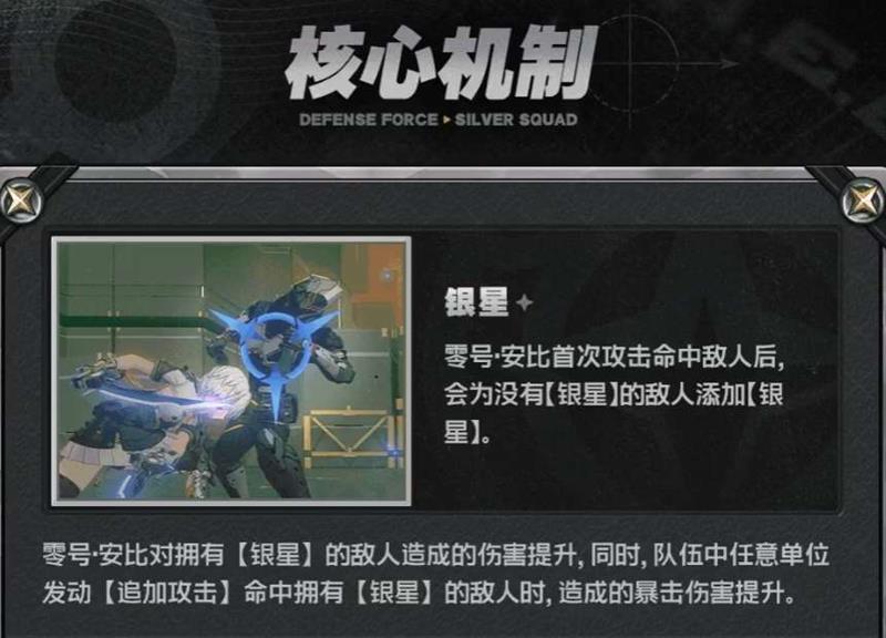 核心技零号·安比的核心技可提升对银星标记敌人造成的伤害,并额外提升标记敌人所受追加攻击的暴伤,提升幅度基于安比自身的暴伤倍率。此外,队伍中存在击破或支援角色时,安比的暴击率提升。