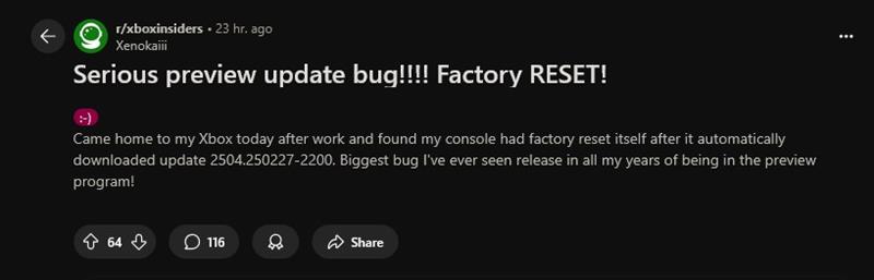 此次问题主要集中在安装了 Alpha 或 Alpha Skip-Ahead 预览版本更新的用户身上。安装更新后,Xbox 配置文件、快速恢复信息以及主机设置均被清除,但值得庆幸的是,主机本地保存的游戏存档并未被删除。