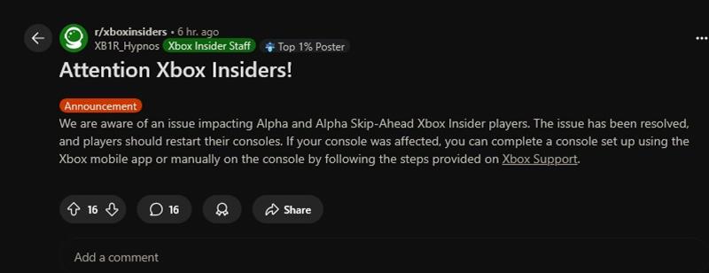 在 Xbox Insider Reddit 论坛上,众多玩家反馈了这一问题,并且纷纷要求微软尽快撤下该更新。对此,Xbox Insider 计划负责团队成员已在论坛上作出回应,表示他们已经知晓更新存在问题,并且问题已经被解决。团队提醒玩家重启主机,并且如果主机已经受到更新影响,玩家可以根据 Xbox 客服提供的步骤来恢复数据。