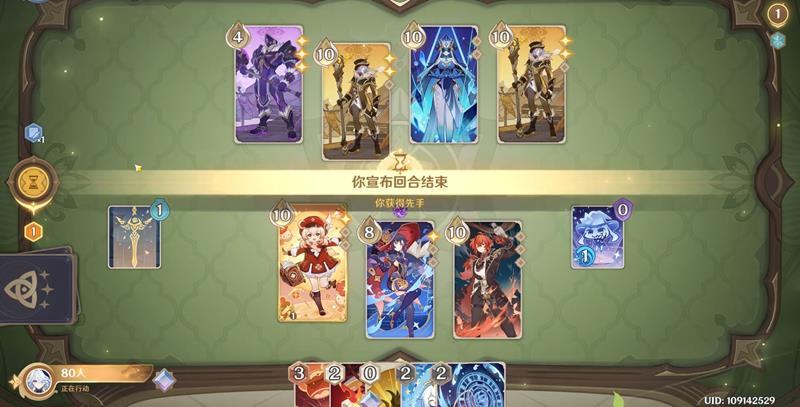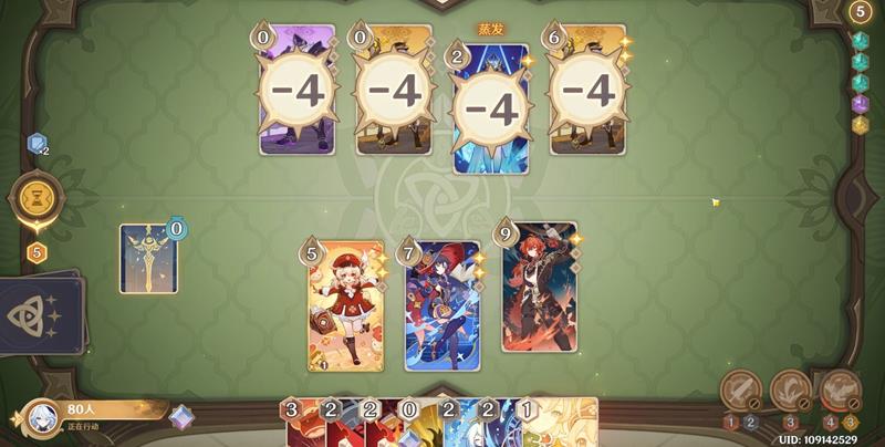第二回合,可莉再次释放元素战技,不要普攻,将愚人众岩使游击兵的生命值压到4血,接着切莫娜释放元素战技,快切迪卢克。回合结束,依然保持我方先手。