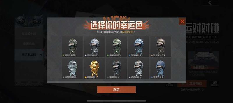 每次游戏前可选择1个幸运色(10种颜色概率均为10%),每拆出同色兵人立即多得2个玩具袋,选个喜爱的颜色为自己冲冲好运!