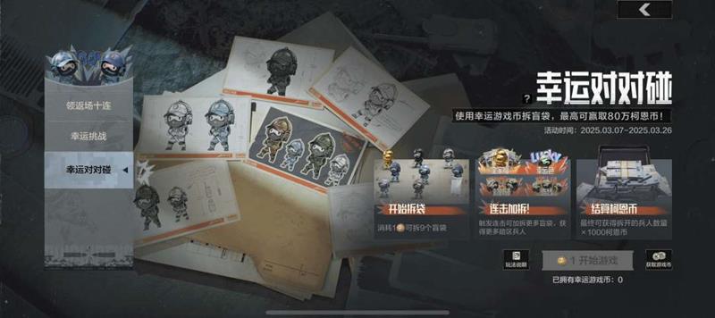 使用幸运游戏币可以拆开9个玩具袋,拆开的暗区兵人若触发幸运色、对对碰、连线、全家福,则可额外获得更多玩具袋,且相应的暗区兵人收起,继续拆剩余的玩具袋,直到活动界面无法触发任何连击为止。