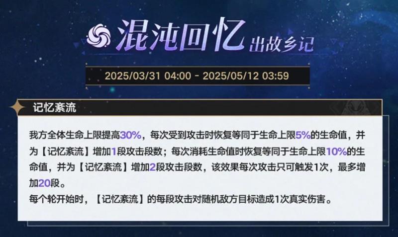 3月31日~5月12日,混沌回忆即将开启。通过官方放出的buff来看,烧血角色将会有更亮眼的表现(看来是打算推下万敌和遐蝶了)。完成挑战还可以获得800星琼,各位开拓者别错过。